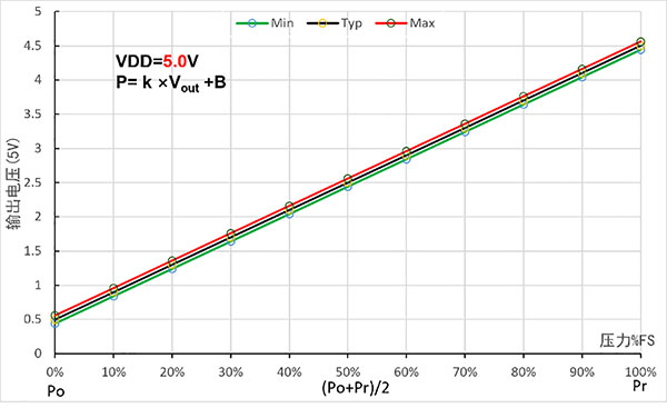 注: Vout はアナログ出力電圧 (単位: V) です。 P は圧力値 (kPa) です。 k. B は、次の表に示すように、線形係数とオフセットを表します。